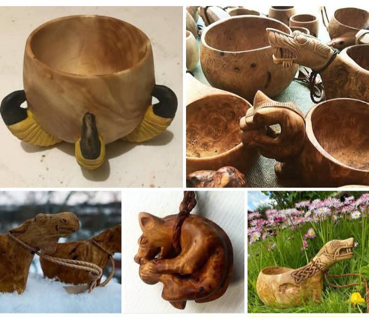 - Trekunst. Kopper, fat, skjeer, smykker, figurer. Mange med fantastiske utskjæringer, ulike utskjæringsstiler relatert til vikingtid.